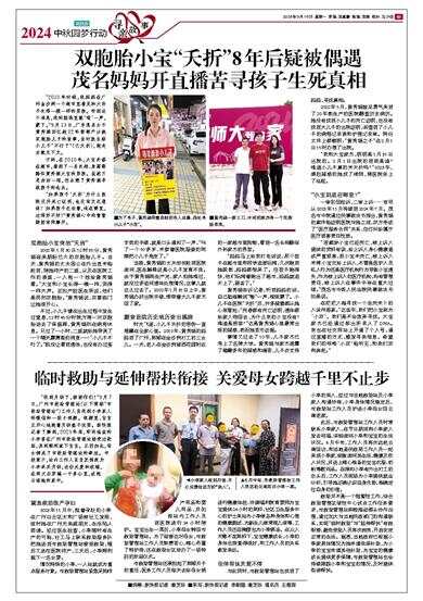 在茫茫人海寻找一个生死未卜的人谈何容易。“这些年,我们把小宝称为‘小双’。我们是不会放弃寻找。大宝家杰已经通过派出所录入了DNA。我也在社交网站上开通了个人号,通过直播的方式,播发寻亲信息。希望我们的呼唤‘小双’能听见,和我们双向奔赴。”
