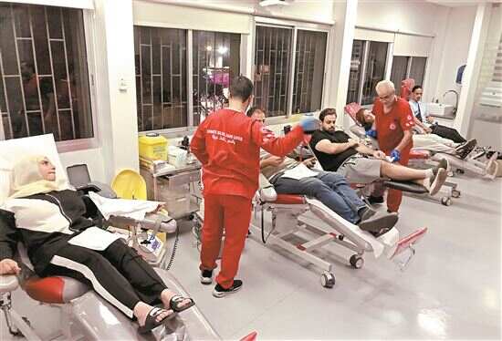 ■9月17日,在黎巴嫩贝鲁特,人们为传呼设备爆炸事件伤者献血。新华社发