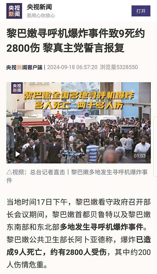 另有媒体援引匿名黎真主党官员的话报道称,爆炸事件是该组织在与以色列近一年的冲突中遭遇的“最大安全漏洞”。