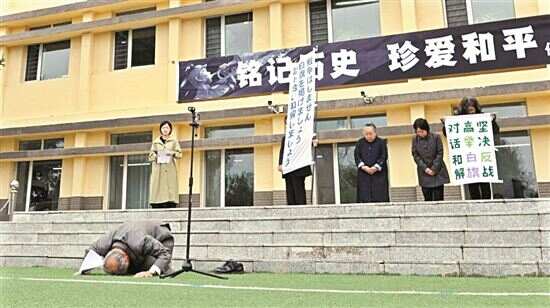 谢罪仪式现场,另有4名侵华日军后代站在台上一同表达谢罪之情。他们手中举着白旗,上面分别用中文、日文书写着“坚决反战、高举白旗、对话和解”。
