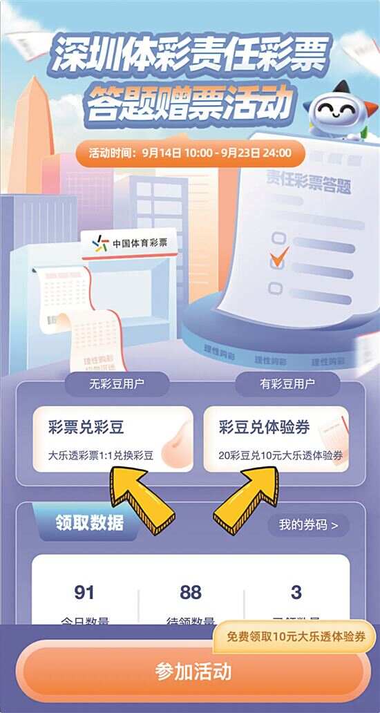 活动期间,市民可通过扫码或搜索“深圳体彩益积分”小程序参与活动。点击首页顶部活动图片进入“深圳体彩责任彩票答题赠票活动”页面,点击“参加活动”,完成责任彩票知识学习后进行答题,答对全部题目即可领取10元超级大乐透机选5注体验券1张,活动期间每人仅可参与1次答题领券活动。体验券可在深圳地区(含深汕特别合作区)任一电彩实体店通过扫描二维码的方式兑换出票。