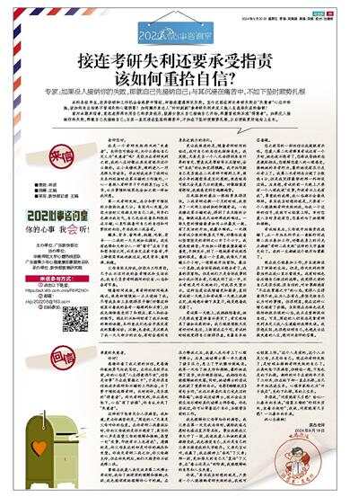 感谢你看了我之前的回信,更感谢你鼓起勇气给我写信。在你从名校毕业前,你的心态是“人生得意须尽欢”,信条是世事“尽在我掌握之中”,于是你很自信地放弃保研和不错的工作机会,为了梦中情校选择考研。此时的你,是乐观的“得意者”。两次考研失利,你从高处坠下,心态“有了动摇”,你自认为成了“失意者”。