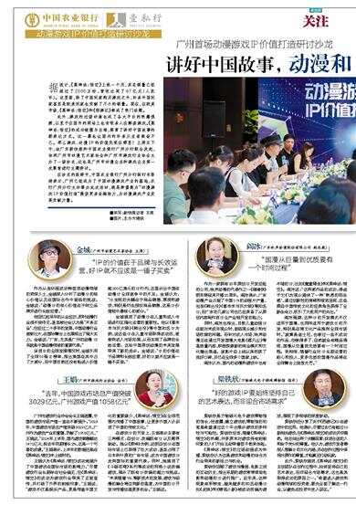 此外,游戏的过场动画也成了各大平台的热播视频,以至于在国外的网站上也有很多人在解读游戏。《黑神话:悟空》的成功破圈与出海,探索了讲好中国故事的新表达方式。这一幕也让国内的许多从业者振奋不已。那么游戏、动漫IP的价值究竟在哪里?上周五下午,由广东新快报和中国农业银行广州分行联合发起,协同广州市动漫艺术家协会和广州市游戏行业协会主办了一场沙龙,这也是广州市动漫企业和游戏企业第一次聚首进行主题研讨。