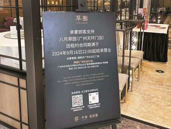 日前,翠园官方小红书账号上发文称,因为租约合同期满,八月翠园(广州天环店)已于2024年9月16日22:00起结束营业。据披露,翠园在内地还有12家门店,其中广州尚余太古汇一家门店。