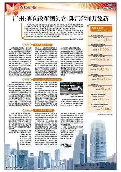 新中国成立75年来,广州敢为人先,勇立潮头,一路奋进,以开放促改革、以改革促发展,实现了从“千年商都”到国际大都市的飞跃,经济总量突破3万亿元大关。新征程上,广州将再向改革潮头立,在进一步全面深化改革、推进中国式现代化建设中当好排头兵,大干十二年、再造新广州,加快建设具有经典魅力和时代活力的中心型世界城市。