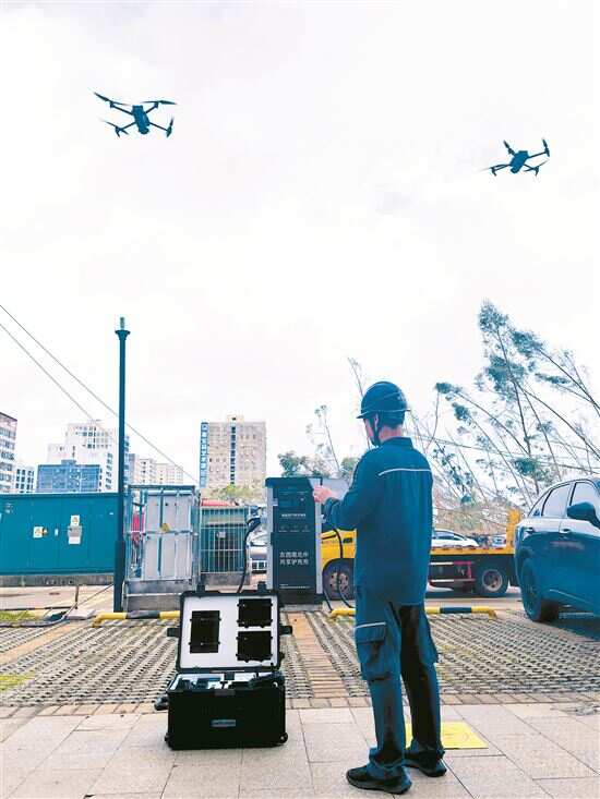9月8日中午,南方电网广东电网应急及风险管理中心智能勘灾研究团队在湛江徐闻海安供电所所辖的10千伏白沙线开展勘灾。智能勘灾团队队员符菲打开手提箱,两台无人机、通信设备设施以及基于机巢的智能勘灾系统映入眼帘。据介绍,这是配网智能勘灾集成系统,集前端实时图像识别、多机自动巡航、实时通信等功能于一体,支持多台无人机同时进行多线路勘灾,巡视操作人员还可在系统端实时获取倒杆、断线、飘挂物等灾损信息。