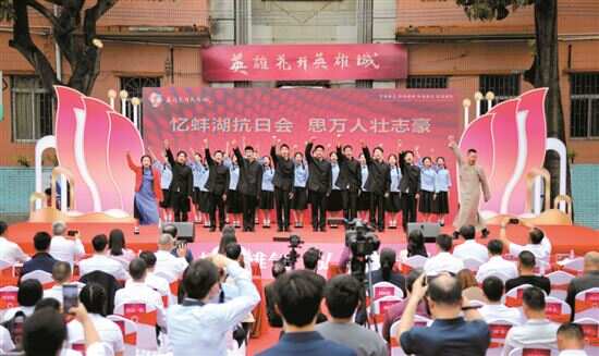 “团结一致,保家卫国!团结一致,保家卫国!”“我们宁可头断血流,粉身碎骨,也要抗战到底!”在前述活动现场,在《回忆蚌湖抗日万人会》师生集体朗诵中,来自广州空港实验中学的30名师生代表,声情并茂地演绎出了当年在大钟楼操场动员抗日万人大会的历史故事,催人泪下,现场观众给予阵阵热烈掌声。