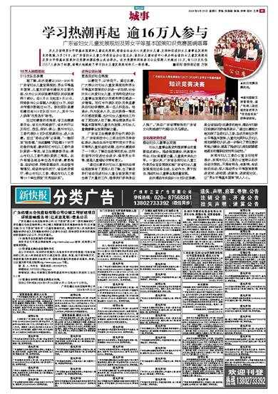 为大力宣传男女平等基本国策和儿童优先原则,营造全社会关心关爱妇女儿童、支持和促进妇女儿童事业发展的良好氛围,9月24日,由广东省妇女儿童工作委员会办公室主办、省妇女儿童活动中心承办的全省妇女儿童发展规划及男女平等基本国策知识竞赛决赛在佛山成功举办。这次竞赛的网络参与公众答题人次超过16万,有519支队伍1557人参加了初赛,南粤大地掀起了学习妇女儿童发展规划的又一轮热潮。
