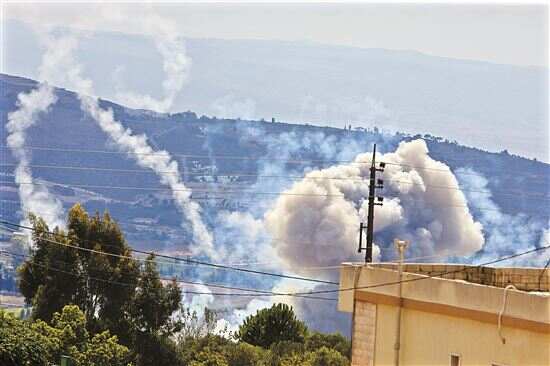 ■9月23日在黎巴嫩迈尔杰云拍摄的以色列空袭黎以边境地区引发的滚滚浓烟。新华社发