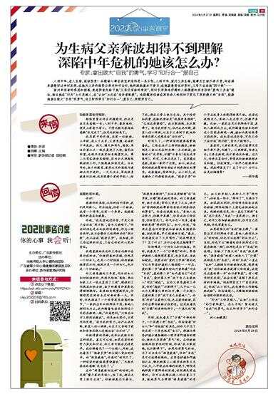 人到中年,老人生病,谁该担责?本期给心事咨询室来信的是一名女性,人到中年,面对父亲生病,她事无巨细尽孝尽责,却在满身疲倦回过神时发现:在她为父亲的病努力奔走和付出时,她的妹妹基本不参与;在她疲惫尝试诉苦时,父母只会劝她“别计较”……