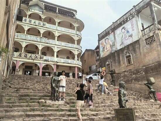 ■松口镇的著名景点火船码头上有不少游客观光。