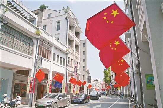 ■在荔湾区恩宁路和上下九步行街,一面面鲜艳的五星红旗悬挂在骑楼下。