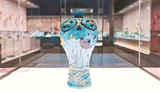 ■9月27日在特展上拍摄的展品——珐华孔雀绿釉莲池纹瓶梅。