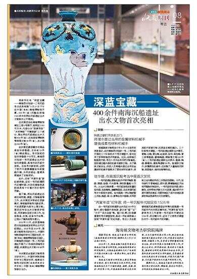 这次展览设在南海博物馆南区三层6号展厅,面积近1000平方米,内容分为“探渊寻珍”“水府琳琅”“巧缮焕新”三个部分,展出两处沉船遗址出水文物408件(套),还有故宫博物院等借展文物34件(套),共计展出442件(套)。