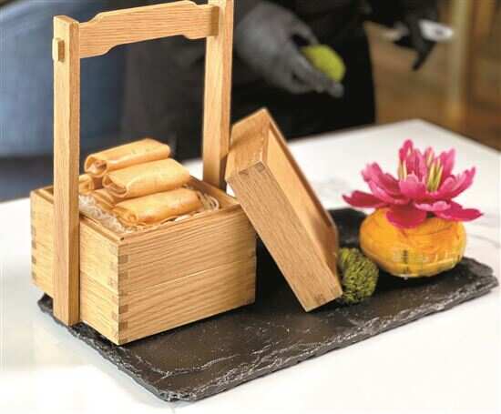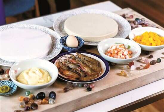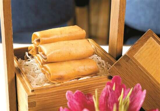 岭南五号酒店的青芥香芒鲜虾春卷用新鲜基围虾、芒果及青芥等制成。
