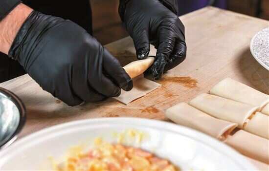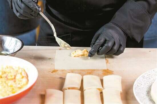 ▲包春卷时馅料不要放太多,太多容易破皮。将馅料摆放在春卷皮中心,紧实卷起。
