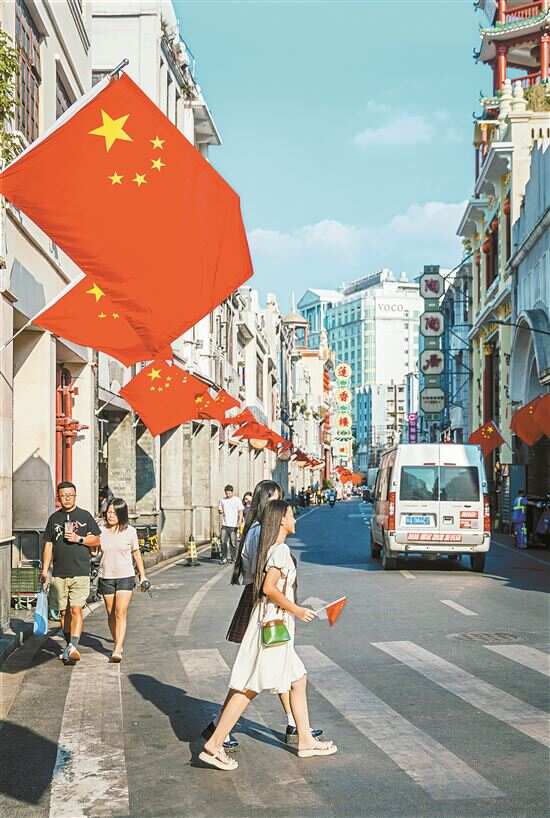 ■国庆期间,广州上下九步行街随处可见国旗迎风飘扬,街道变身一片“红色海洋”,洋溢着浓浓的节日氛围。 新快报记者 观显锋/摄