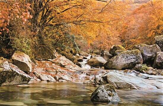 漫山红叶,秋意尽染,而那红,红得层层叠叠,红得毫无间隙,布满整个山岭,无论是林间还是小道,无论是流水处还是石上青苔,深浅不一的红叶是永恒的“主角”。