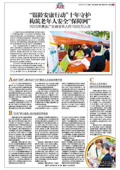 老有保障:“银龄安康行动”实施十年以来,在完善老龄健康服务体系等方面的积极作用日益显现,受到社会各界广泛赞誉。从2014年覆盖服务老年人15%,到2023年覆盖服务96%,为广东省约1500万人次送老龄健康保障服务,老年人的幸福感、获得感和安全感逐步增强。“银龄安康行动”被国家发改委、全国老龄办评为全国75个养老服务业发展典型案例之一;全国两会专题报道广东构建了老年人保障服务创新体系,充分发挥保险业经济补偿的作用。