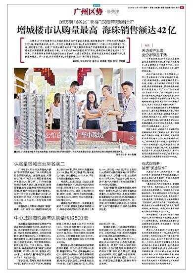 数据显示,国庆期间海珠区在售楼盘到访量超1万人次,成交认购530多套,销售面积约6万㎡,总销售金额达42亿元,海珠区也是唯一公布总销售额的城区;经汇总大型房地产经纪机构数据,海珠区国庆期间二手存量房成交170多套,总成交金额约5亿元,同比2023年上升一倍。