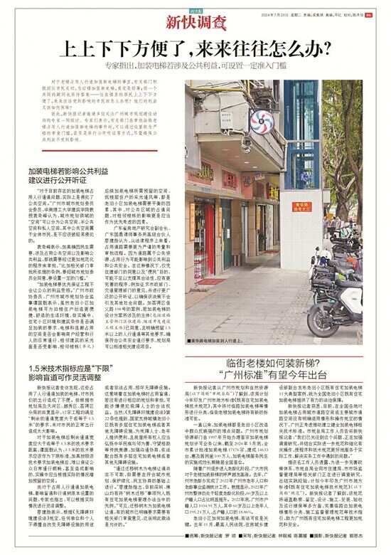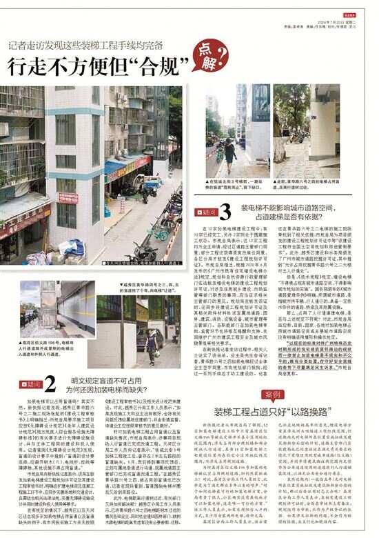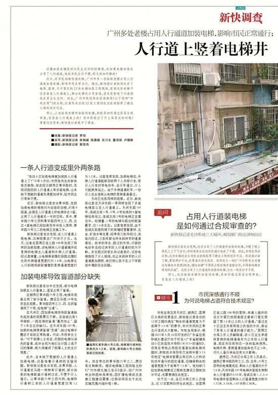 今年7月,新快报发布了“广州多处老楼占用人行通道加装电梯,影响市民正常通行”的报道(详见2024年7月23日04-06版以及新快报公众号),对广州市内几处加装电梯是否占用人行通道的问题进行了探讨。《技术规范》进一步回应了临路边加装电梯的社会关切,有关人员提出将根据具体情况来分个案讨论。