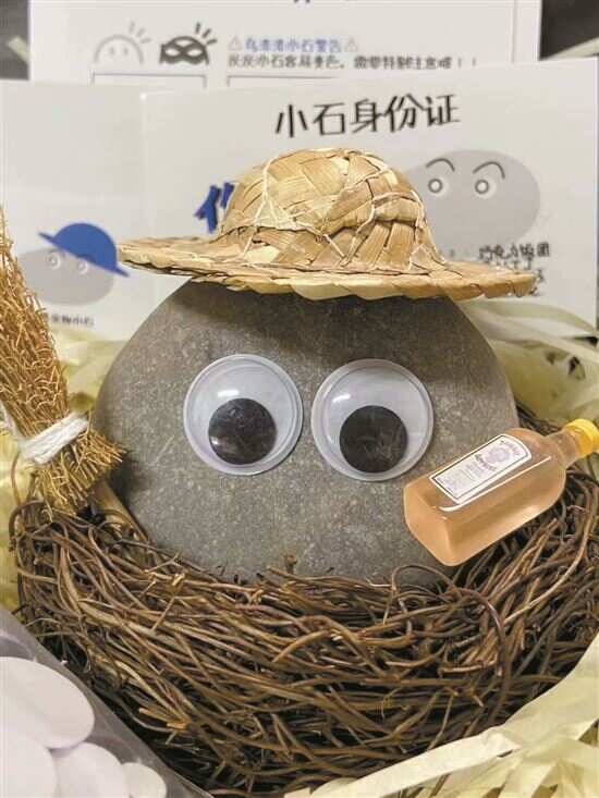 这块石头被苗女士放在一个藤条编成的小窝里,上面贴着一对卡通大眼睛,旁边还摆放着一瓶微型酒瓶。这些装饰让斯玛特看上去像个随时待命的调酒师。草帽的点缀进一步增强了它的个性,而背景中的“石头身份证”则为它增添了仪式感。