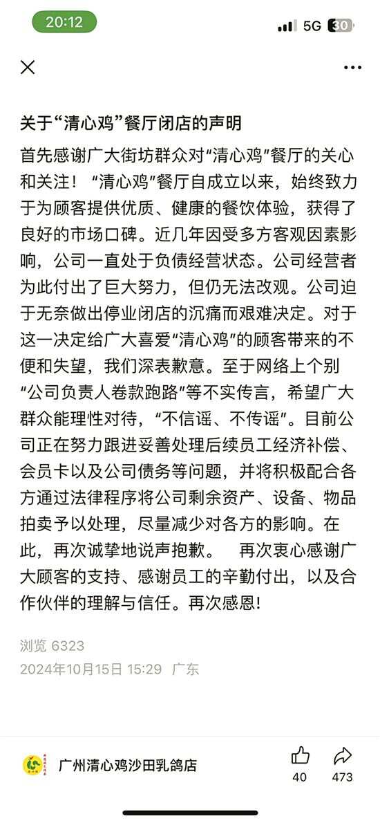 10月14日,《新快报》报道了广州多家“清心鸡”门店暂停营业的消息。就在一天之后,沉寂许久的“清心鸡”微信公众号发出一则公告,称老板跑路传言不实。