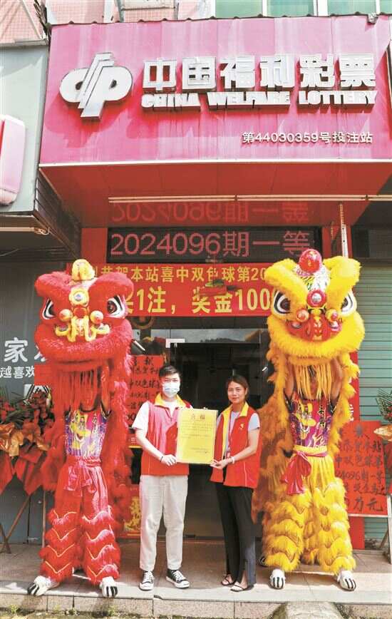 大奖诞生后,44030359福彩销售站点举行舞狮庆祝活动,珠海市福利彩票发行中心为站主送上幸运福彩站金漆牌匾,现场醒狮热舞、锣鼓喧天,吸引了众多路人驻足围观,大家纷纷进站效法中奖者购买双色球。