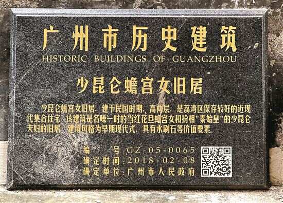 根据广州市人民政府所立的“广州市历史建筑 少昆仑蟾宫女旧址”的标识牌资料显示,这栋建筑建造于民国初期,在上世纪50年代时期成为少昆仑、蟾宫女夫妇的居所——这两位当年可谓是粤剧领域名噪一时的人物,花旦配武生,颇有盛誉。少昆仑是历史上的广东南海人,原名陈庆伦,是土生土长的本省粤剧下乡班演员,擅长武生、小武和大花脸等,基本功扎实,尤其是腰腿功夫特别好。少昆仑师承著名武生赵子龙,因为受外来艺术的影响较少,所以少昆仑的技法基本上可以算是本土固有的南派技法,哪怕他曾经一度长期在东南亚一带演戏,也依然保持着纯正本土技法。由于他南派功底的浑厚,也因为他身手矫健,演出时神形兼备且戏路比较宽广,而被冠之以“大猛特猛真军小武”的名号……
