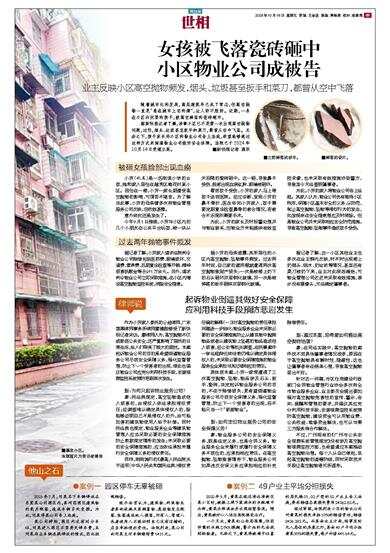 廖:物业服务公司的安全保障义务,既是法定义务,也是合同义务。物业服务企业未履行或履行安全保障义务不到位的,应承担相应责任。在高空抛物、坠物致害情形下,物业服务公司如果违反安保义务应承担相应的补充赔偿责任。