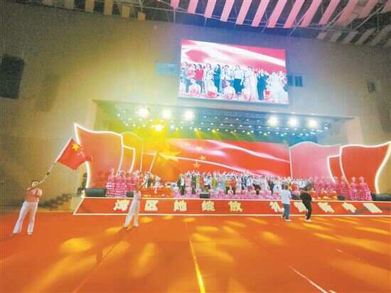 “我和我的祖国,一刻也不能分割……我最亲爱的祖国,你是大海永不干涸,永远给我碧浪清波,心中的歌……”当进行到大合唱《我和我的祖国》时,全场起立,挥舞着国旗,齐声高歌,把现场气氛推向了高潮,音乐声止,不少姐妹仍小声哼唱。