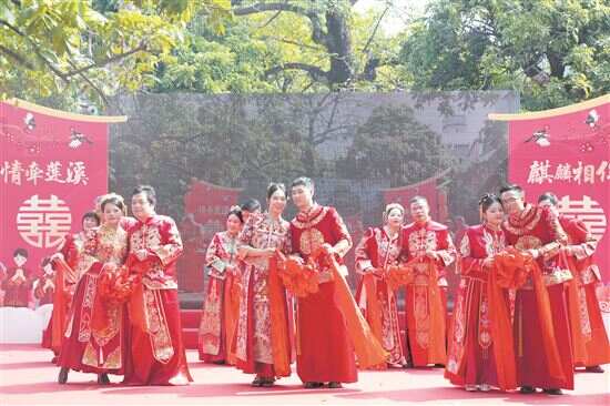 新快报讯 记者林钢威 郭思杰 通讯员邹莉清摄影报道 9对夫妻、1场婚礼,莲溪荷畔、连理树下,情定一生。10月19日,2024年“情牵莲溪 麒麟相伴”传统婚俗文化体验活动在广州市南沙区黄阁镇莲溪村麦氏大宗祠前广场举办。9对涵盖老、中、青等年龄段的夫妇共同体验出阁礼、上头仪式、揭红盖头、捞起仪式、撒米仪式、夫妻对拜、合卺交杯、结发礼、五福等传统婚俗文化仪式。这场活动是黄阁镇,也是南沙区首次举办的传统婚俗文化体验活动。活动在黄阁特色麒麟舞表演中拉开序幕,9对夫妻完整演示了出阁礼(挽面、描眉、印唇、映容)、上头、接亲、揭红盖头、捞起、撒米、夫妻对拜、合卺交杯、结发礼等仪式。