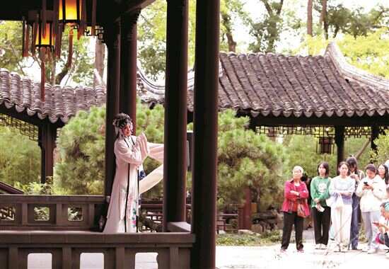 ■演员在苏州虎丘山景区为游客表演昆曲。