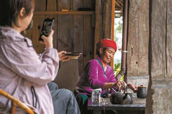 ■游客在云南景迈山翁基古寨拍摄布朗族老人制作罐烤奶茶。