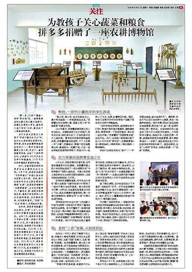 “种春天种的是希望,希望孩子们从关心身边的‘粮食和蔬菜’开始关心农业和乡土,在和土地的互动中思索人类和自然。”拼多多相关负责人介绍,“从这间小小的农耕博物馆出发,我们希望能将农业的种子播撒到孩子的心中,让他们不仅能够收获知识,还能收获对自然和土地的敬畏与爱护,期待他们能够成为未来农业的守护者,用他们的智慧与热情,为‘三农’带去更多绿色与希望。”