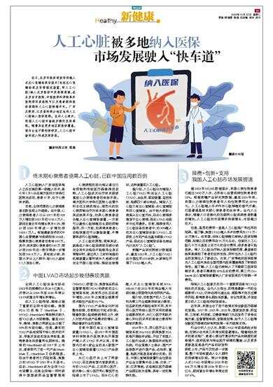近日,北京市医保局宣布将植入式左心室辅助泵安装术(包括左心室辅助泵及导管固定装置,即人工心脏)纳入北京医保甲类报销范围,在北京安贞医院、中国医学科学院阜外医院等四家医院可以为患者提供医保报销的人工心脏移植手术。广东及陕西、江苏省的部分地区也将人工心脏纳入医保报销。业内人士表示,我国人工心脏市场起步晚但发展亮眼。随着其在更多地区获医保覆盖,国内企业不断创新研发,人工心脏市场将进入快速发展阶段。