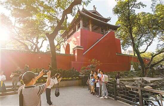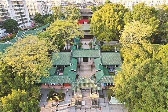 午后艳阳如金色绸缎,轻柔铺洒在“岭南第一楼”的绛红色高墙上,树影也来婆娑几笔,于是这岭南彩墨画,就在游客抬眸时流淌开来。