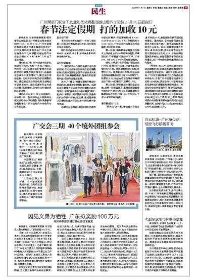 新快报讯 记者许婉婕报道 明年春节法定假期,在广州乘坐出租车每次加收10元。10月31日,广州市发展改革委会同市交通运输局印发的《广州市发展和改革委员会广州市交通运输局关于优化调整巡游出租汽车运价的通知》(下称“通知”),作出了上述规定。