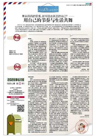 那篇文章中透露出很多单亲母亲情绪消极,独木难支的感觉。我也曾有过那样的时候,虽然非常短暂,但确实对心理的捶打力度比较大。回想起来,一方面是受伤,但更多的是成长,这对我来说也是很好的事情。很多时候,我觉得是老天安排的人生课题,当你一次次面对,一次次解答,答案会越发明晰。那就是,一定要以及要怎样活出自己仅有一次的人生。不是作为谁的妻子、母亲、女儿或任何其他角色,而是真正的自己。想明白这些后,珍惜当下和感恩生命就成为我内心最厚重的底色,会不断地调整自己的情绪和生活节奏,松弛自然地面对一切。当然了,也有偶尔情绪不好的时候,运动、音乐和文学是我忠实的朋友,受益匪浅。