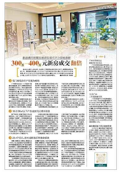 新政出台满月,在低首付、低利率、不限购等政策利好的支持下,刚需购房群体加速入市。据数据机构监测,300万元以下总价新房成交环比增长55%,吸引不少异地客群;而300万至400万元总价新房成交更环比翻倍,成为10月份增长至为迅速的细分市场,尤其是90平方米以下小户型的成交量显著增加。