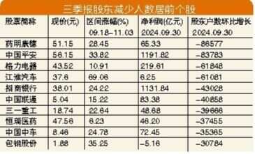 在三季度股东户数减幅榜中,药明康德以减少8.6万户股东排名第一。中国平安、格力电器、江淮汽车和招商银行位列前五。此外,中国联通、三一重工、包钢股份和恒瑞医药等也是大资金青睐的个股,三季度股东减少人数均超3万人。股东户数增幅榜方面,拓维信息增加13.9万股东,变动比例达55.36%。大众交通和国海证券,新增11.6万股东,变动比例73.6%。从股东户数减少比例来看,金麒麟、华体科技、深圳瑞捷、华阳智能和中创股份减少比例均超45%。江淮汽车、南玻A和东山精密等变动比例超过20%。