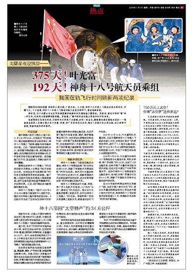 神舟十八号载人飞船返回舱成功着陆,神舟十八号乘组在轨飞行总时长达到192天,刷新了我国航天员乘组在轨飞行时长纪录。航天员叶光富在轨飞行总时长达到375天,刷新我国航天员在轨驻留时间的纪录,成为目前我国在轨飞行时间最长的航天员。