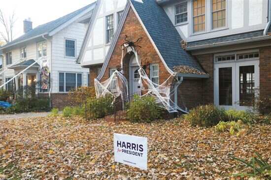 ■早前,民主党总统候选人哈里斯在美国密歇根州安阿伯举行竞选集会,这是集会地点附近一处民居前布置的支持哈里斯的标牌。 新华社发