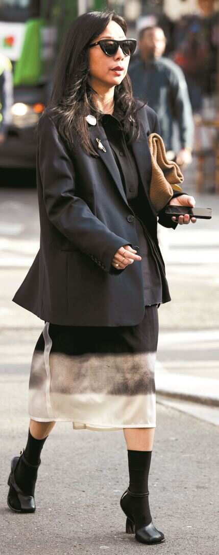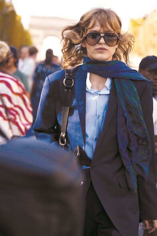 全身选择同色系固然是“偷懒讨巧”的穿搭小心机,为区别穿搭层次,可在服装面料上做文章,利用单品间“刚”与“柔”的风格冲突制造高级感。如用粗粝质感的大衣搭配缎面裙装,视觉上中和朴素与华丽、厚重与轻盈,最大限度发挥海军蓝沉稳大气的特质。