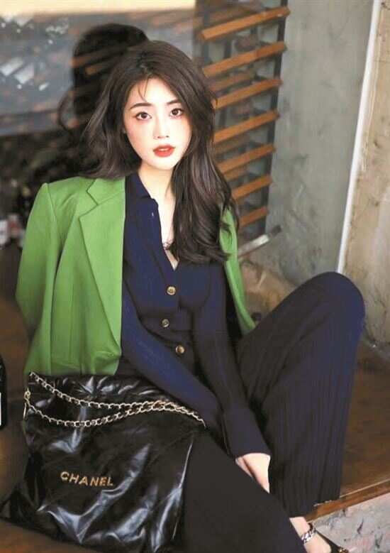 海军蓝色属深色调,如黑色,自身隐去光芒,如果再搭深色系容易让造型整体显黯淡,想激活海军蓝的时髦感,可适当加入一些活泼的点缀色,营造强烈的视觉冲击,打造精致又时髦的氛围。