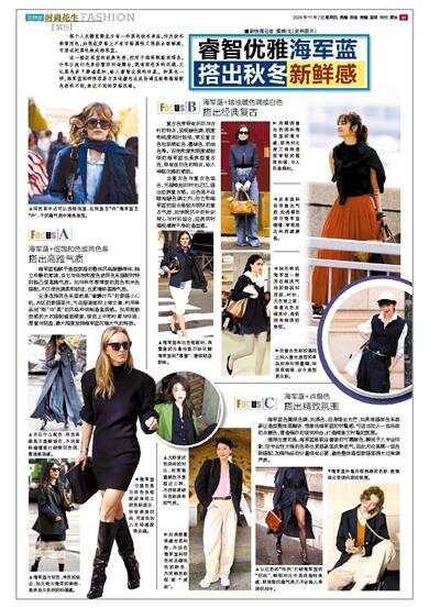秋冬季的海军蓝一般用在展现气场的服装如西装、衬衫、大衣等上面,将复古色点缀其中,是低调有格调的穿搭。