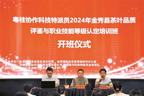 金秀茶叶生产历史悠久,目前全县茶园面积5.5万亩,成为金秀特色产业的一张名片。9月19日,粤桂协作科技特派员——金秀2024年茶叶品质评鉴与职业技能等级认定培训班正式开班,广东省茶叶收藏与鉴赏协会相关专家为50名学员授课,提高茶叶从业人员的专业素养和技艺水平。