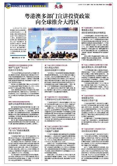 11月8日下午,2024粤港澳大湾区全球招商大会的系列活动之一——粤港澳大湾区投资政策宣讲会在广州白云国际会议中心举行。香港商务及经济发展局、澳门招商投资促进局,以及广东省商务厅、省发改委(大湾区办)、省科技厅、省工信厅、省委金融办、省人社厅、省自然资源厅、省生态环境厅等有关负责人介绍投资政策,卖力推介大湾区。