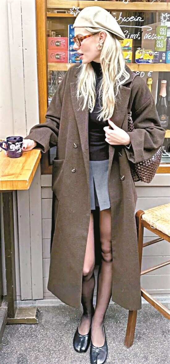 视觉“轻量化”的薄底鞋搭夸张单品,可对冲掉过多的怪异感,令造型更协调。