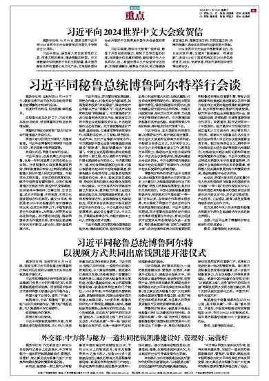 “中方将以两国元首共识为引领,坚持共商共建共享,与秘方一道共同把钱凯港建设好、管理好、运营好,赋能包括中秘两国在内的太平洋沿岸经济体共同发展,使之真正成为秘鲁乃至广大拉美和加勒比国家的繁荣幸福之路。”他说。